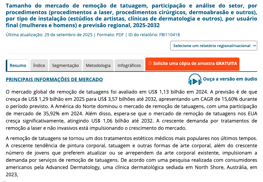 O mercado global de remoção de tatuagens foi avaliado em US$ 1,13 bilhão em 2024. A previsão é de que cresça de US$ 1,29 bilhão em 2025 para US$ 3,57 bilhões até 2032, apresentando um CAGR de 15,60% durante o período previsto. A América do Norte dominou o mercado de remoção de tatuagens, com uma participação de mercado de 35,92% em 2024.